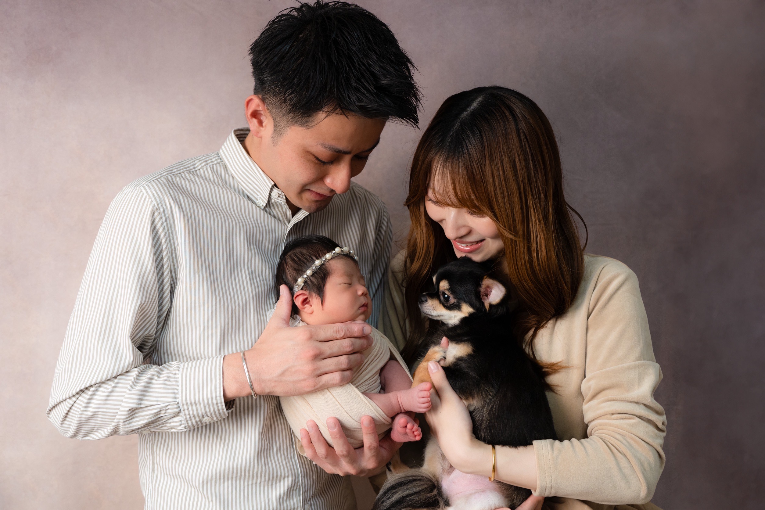 新生児だけでなく、ご家族みなさまでの撮影も歓迎しております。赤ちゃんを囲む温かな表情や、初めての家族写真も大切に残します。家族の絆を感じられる大切な時間を、写真に込めてお届けします。