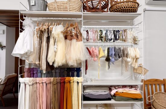 撮影エリアには、プロ仕様の専門設備や照明が整っています。海外から取り寄せた特別なマタニティドレスや、撮影用の小道具や赤ちゃん用衣装を種類豊富に取り揃えており、赤ちゃんやママに合わせた特別なスタイリングが可能です。オムツや哺乳瓶、授乳チェアなどのベビー用品も完備しているので、安心して撮影にお越しいただけます。