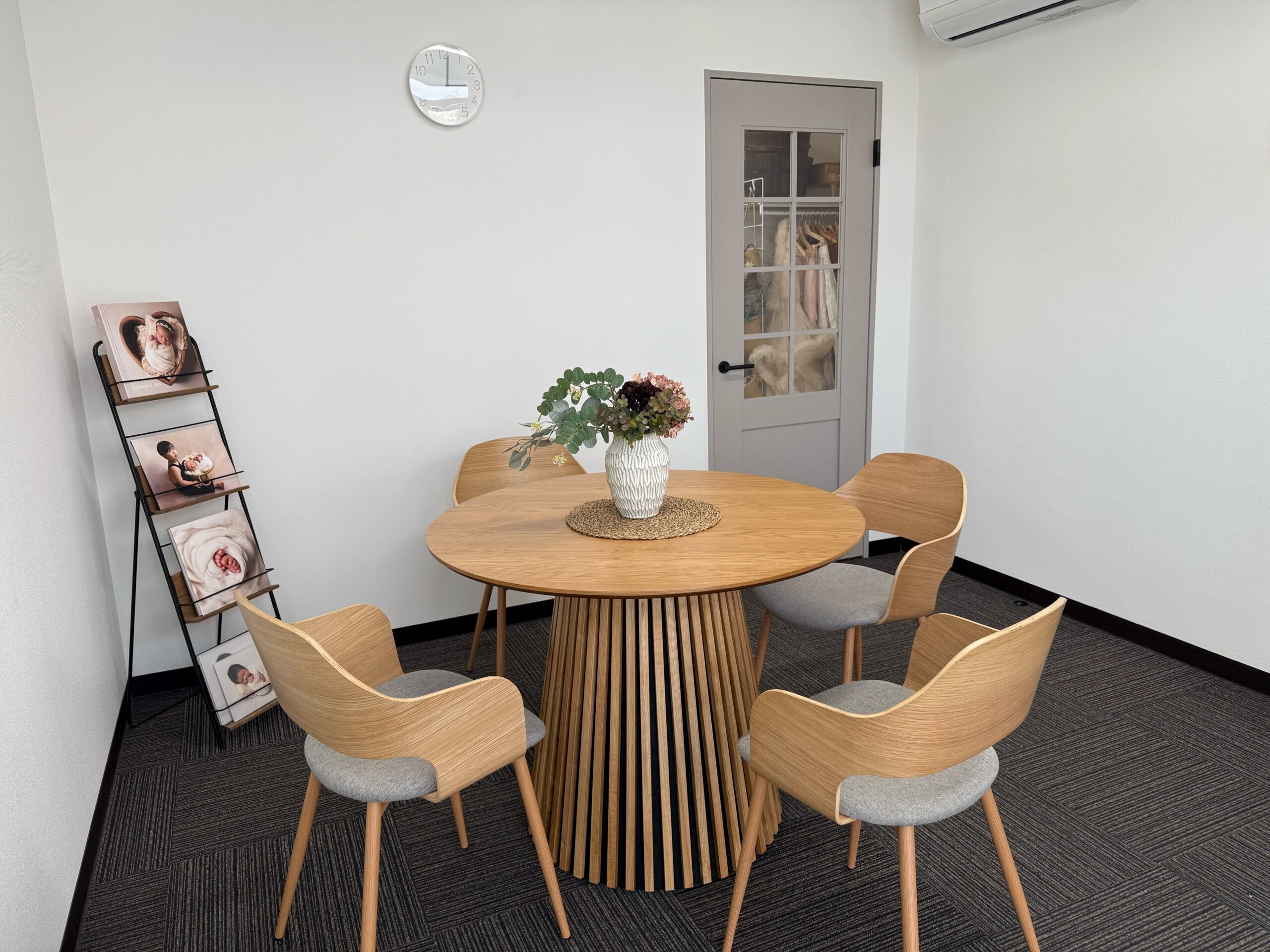 ご家族はラウンジでゆっくりと過ごしながら、赤ちゃんの撮影の様子を見守ることができます。スタジオは子ども連れのご家族にも便利な立地で、近くには遊べる公園やスタジオ内のキッズコーナーもあります。